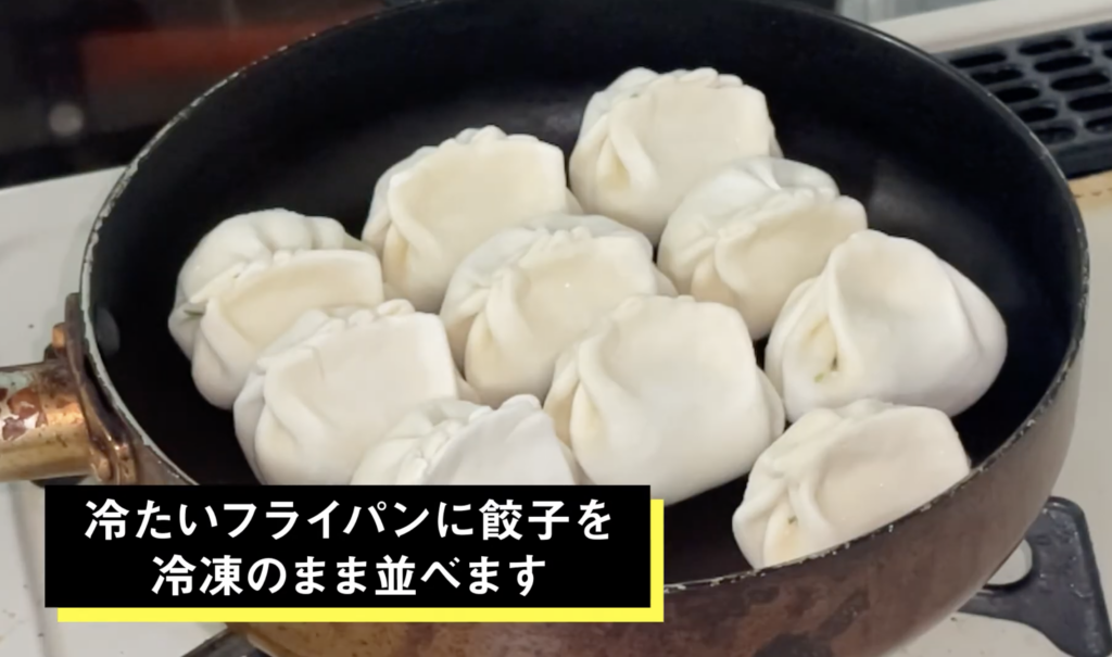 まずは火をつけない状態で、フライパンに冷凍されたホワイト餃子を並べていきます。