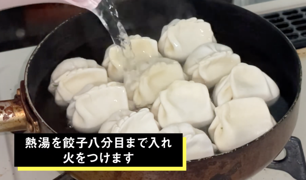 餃子を並べ終えたら、フライパンに熱湯を注ぎます。