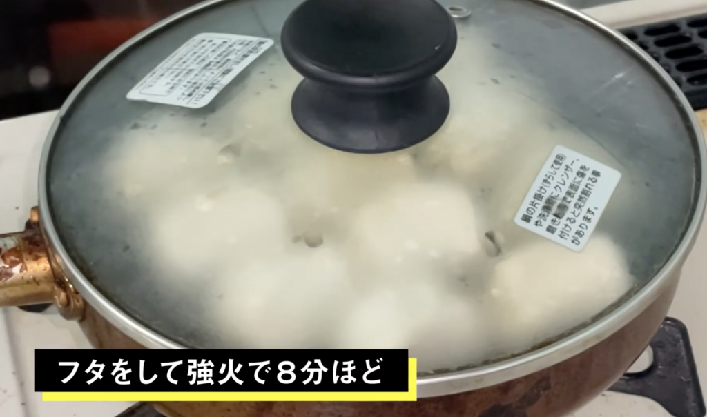 熱湯を入れて強火にしたら、フタをして約8分ほど蒸し焼きにします。