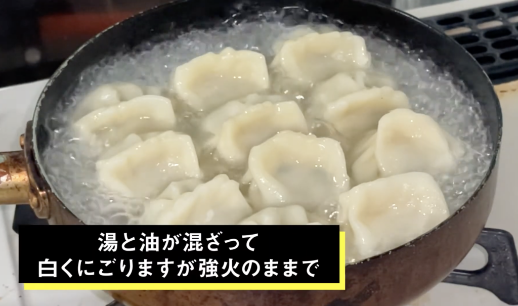 ホワイト餃子はしっかり油を入れて、揚げ焼きにするイメージで仕上げるのがポイントです!
