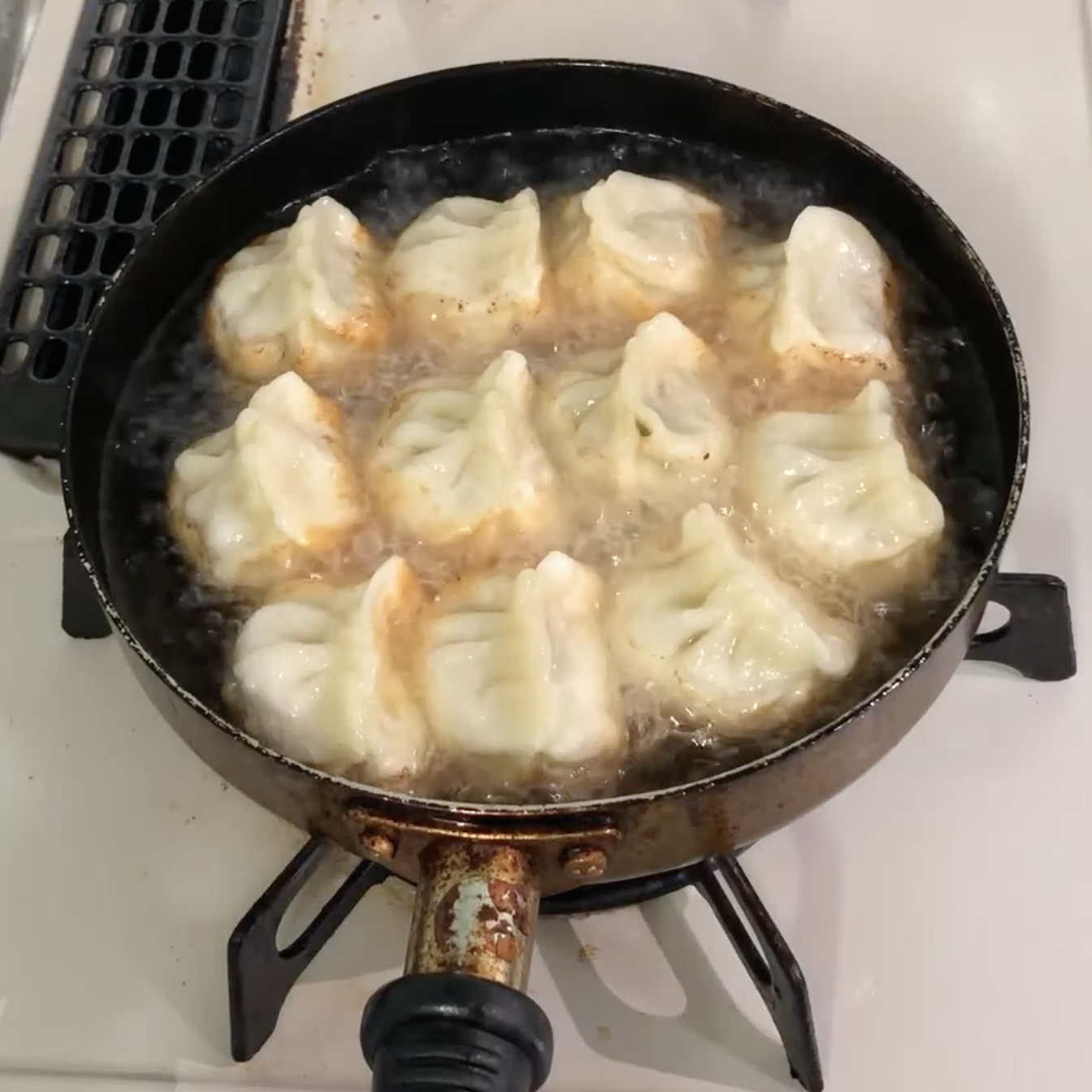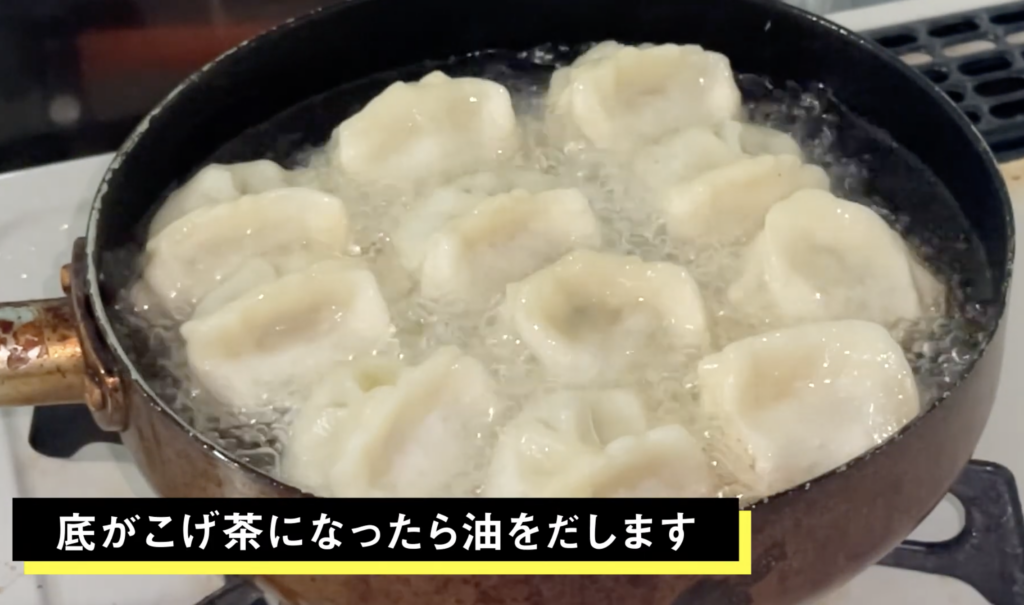 餃子の底が焦げ茶色になってきたら、焼き色がしっかり付いてきた合図です。